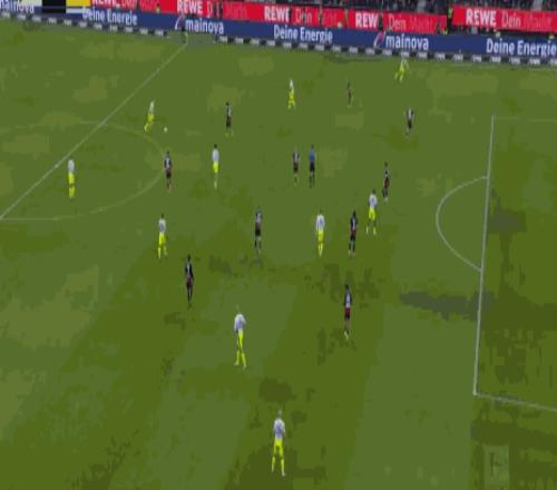 第19分钟,法兰克福前场右侧边线球,克里斯藤森大力往禁区里掷过去,泰特前点抢点头球摆渡一顶,吉拉西争抢第2落点时推倒科赫,主裁果断吹罚了点球。尤尊操刀主罚一蹴而就,法兰克福1:1快速扳平比分。易边再战两队还是对攻之势,第67分钟,多特前场左侧转移到右侧,连续的传中都被法兰克福挡出,只是法兰克福多次解围都未能将球踢远,最后一次泰特解围反而是踢到禁区右侧前沿恩梅查的脚下,恩梅查将球拦下调整一步右脚大力扫射,皮球击中右侧门柱内侧弹入网窝,多特2:1再次取得领先。